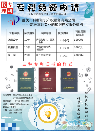 正文摘要:專(zhuān)利免費(fèi)申請(qǐng)!!(僅對(duì)韶關(guān)企業(yè)和戶(hù)籍人口)韶關(guān)市科衡知識(shí)產(chǎn)權(quán)服務(wù)有限公司-----韶關(guān)本地專(zhuān)業(yè)的知識(shí)產(chǎn)權(quán)服務(wù)機(jī)構(gòu)地址:韶關(guān)市武江區(qū)工業(yè)東路24號(hào)陽(yáng)光康地A棟702房電話:0751-8536926聯(lián)系人:王工手 機(jī) ... |