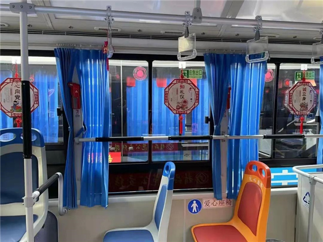 車廂內(nèi),一面面鮮紅的黨旗、國旗成為了最靚的風(fēng)景和最暖的愛國情懷,不僅使國慶節(jié)的氣氛變濃了,也使得每一位乘客的愛國情感變得更加濃郁,充分表達了我們公交人對祖國的敬重和強烈的愛國情懷;“我愛祖國”“歡度國慶”等貼紙、拉花,更是渲染了濃濃的國慶喜慶氛圍;“核心價值觀”“彩色中國結(jié)”“孝老敬親”等中國傳統(tǒng)文化精髓,以宣傳畫的形式展示在車廂內(nèi),通過公交這個文明窗口,使廣大乘客在乘車時就能被中國優(yōu)秀傳統(tǒng)文化所熏陶,進一步提高國慶節(jié)期間運營服務(wù)質(zhì)量的同時,一股股濃濃的愛國情懷也不由在每個人的心中涌動。
