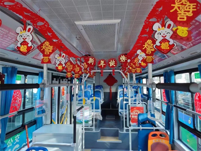 在209路車隊(duì),車廂、站務(wù)室、辦公區(qū)域處處洋溢著喜慶的中國(guó)風(fēng),生肖窗花張貼在車窗兩側(cè),可愛的卡通兔“微笑”著向乘客們送著“祝福”,“新年快樂”的拉花昭示著中華民族的傳統(tǒng)佳節(jié)即將到來。