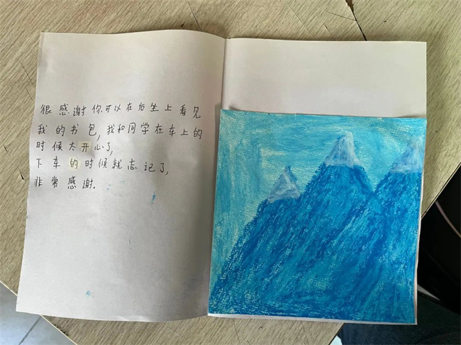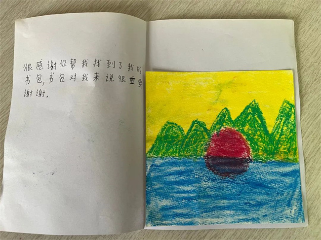 打開這封信,是一封由小朋友自己親手制作的感謝信,信中寫道:“很感謝你在后座上看見我的書包,我和我的同學在車上的時候太開心了,下車時就忘記了,非常感謝?!薄昂芨兄x你幫我找到了我的書包,書包對我來說很重要,謝謝。”