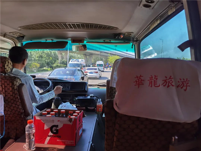 比賽開始后,為保障參賽選手的安全,華龍公司5臺(tái)中巴車輛又化身“賽道收容車”,緊跟在組委會(huì)領(lǐng)頭車輛身后,沿著參賽選手的比賽路線,一路伴隨著參賽選手行駛,為比賽途中發(fā)生意外及體力不支的運(yùn)動(dòng)員提供幫助。