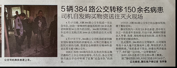 醫(yī)院里有不少肢體障礙的病人、生活不能自理的病人,還有一些精神病患者,從醫(yī)院轉(zhuǎn)移到車?yán)锸殖粤?。留下?名駕駛員和下班后聞?dòng)嵹s到的馮永斌等7名駕駛員毫不猶豫地沖上前,連扶帶抬,連背帶扛,將患者轉(zhuǎn)移到車上。醫(yī)院對(duì)面就是火場(chǎng),駕駛員們不顧自身安危,連水都來(lái)不及喝上一口,緊張有序、有條不紊的進(jìn)行疏散工作。直至晚23時(shí)30分,成功將所有醫(yī)患人員輸送至馬耳山分院。