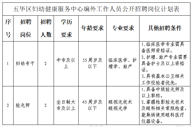 本次編制外人員招聘崗位:驗光師2名、婦幼專干2名,本次招聘不設(shè)期限,以所需人員招滿為截止時間。
