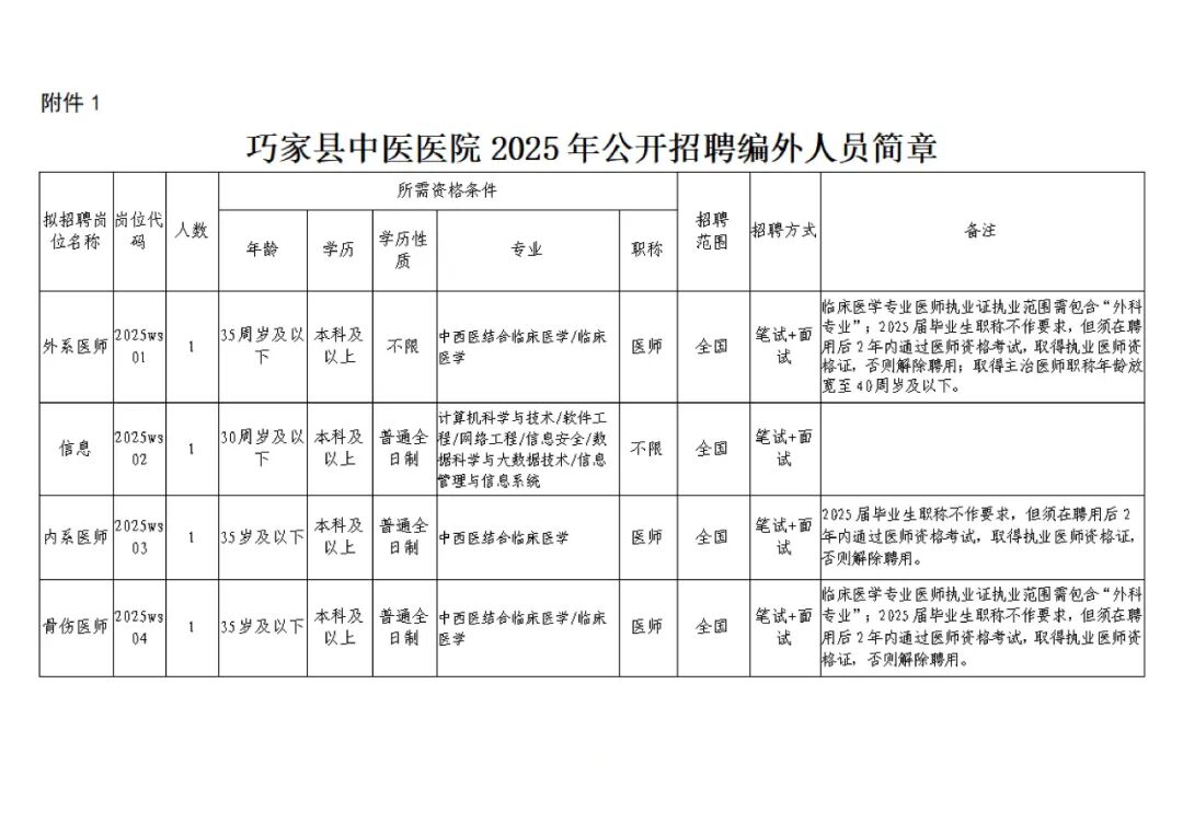 (一)崗位設(shè)置:詳見附件《巧家縣中醫(yī)醫(yī)院2025年公開招聘編外人員簡章》。