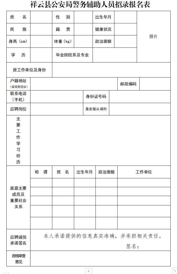 3.報名方式:本次招聘采取本人現(xiàn)場報名形式開展,不接受他人代報,應(yīng)聘人員報名前應(yīng)仔細(xì)閱讀招聘公告,真實填報《祥云縣公安局警務(wù)輔助人員招錄報名表》(自行下載報名表)。