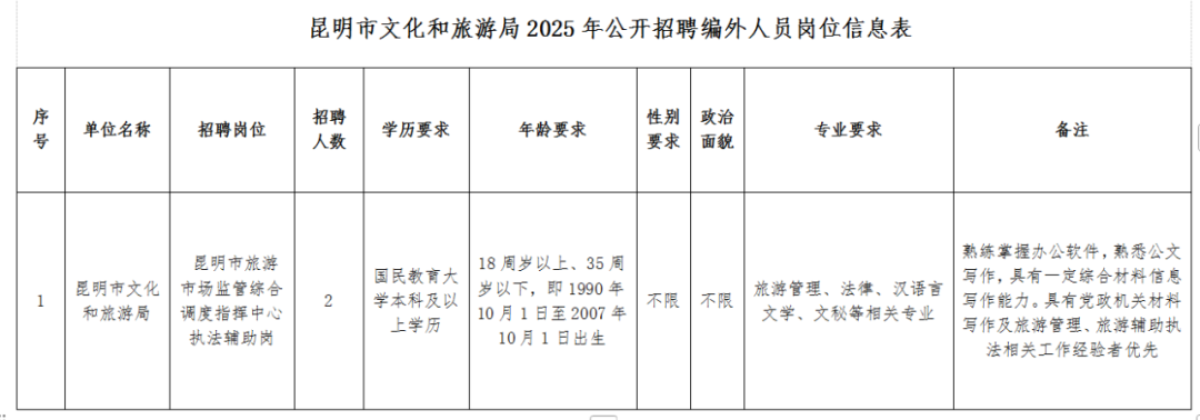 本次共招聘2人。崗位詳見附件1.《昆明市文化和旅游局2025年公開招聘編外人員崗位信息表》。
