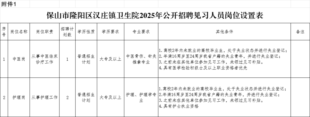 附件1.隆陽區(qū)漢莊鎮(zhèn)衛(wèi)生院2025年公開招聘見習(xí)人員崗位設(shè)置表.xlsx