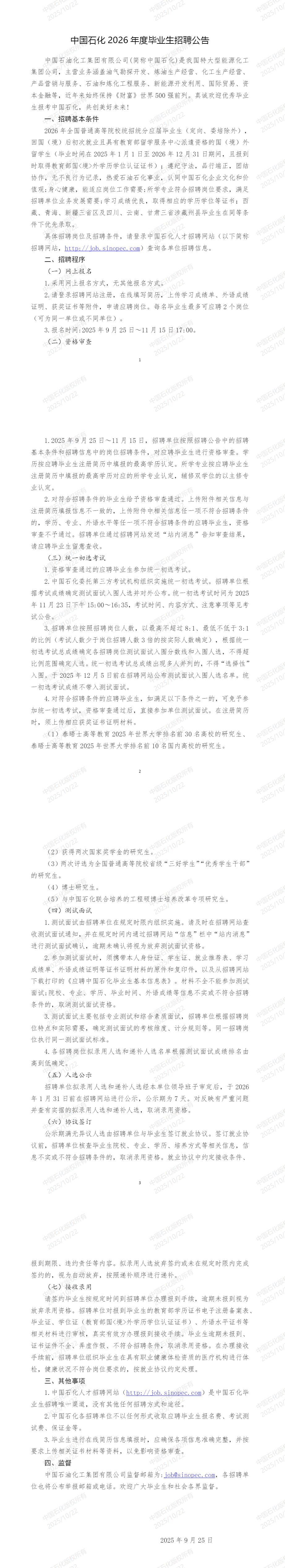 來源:https://job.sinopec.com/#/school/groupNoticeDetail?id=195167664b46dbb913ef6f14d7817938&title=%25E4%25B8%25AD%25E5%259B%25BD%25E7%259F%25B3%25E5%258C%25962026%25E5%25B9%25B4%25E5%25BA%25A6%25E6%25AF%2595%25E4%25B8%259A%25E7%2594%259F%25E6%258B%259B%25E8%2581%2598%25E5%2585%25AC%25E5%2591%258A
