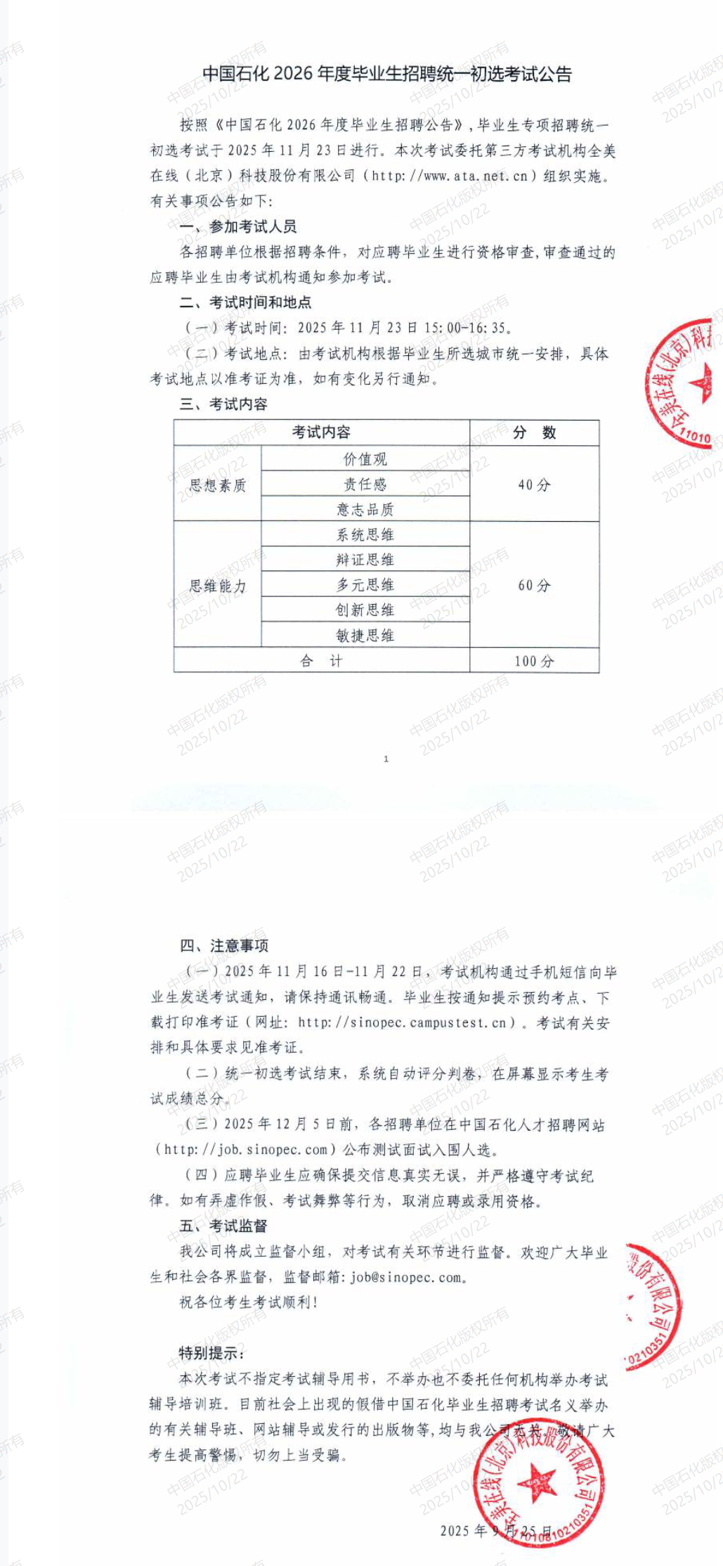 中國石化2026年度畢業(yè)生招聘統(tǒng)一初選考試公告