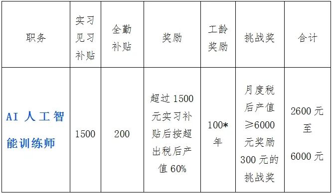 綜合薪資: 2600元-6000 元,實(shí)習(xí)見習(xí)補(bǔ)貼1500元+全勤補(bǔ)貼200元+績(jī)效獎(jiǎng)勵(lì)(超過(guò)1500元實(shí)習(xí)補(bǔ)貼后按超出稅后產(chǎn)值的60%計(jì)提)+工齡獎(jiǎng)勵(lì)100元/年+月度挑戰(zhàn)獎(jiǎng)300元,轉(zhuǎn)正后簽訂正式勞動(dòng)合同,購(gòu)買社保。
