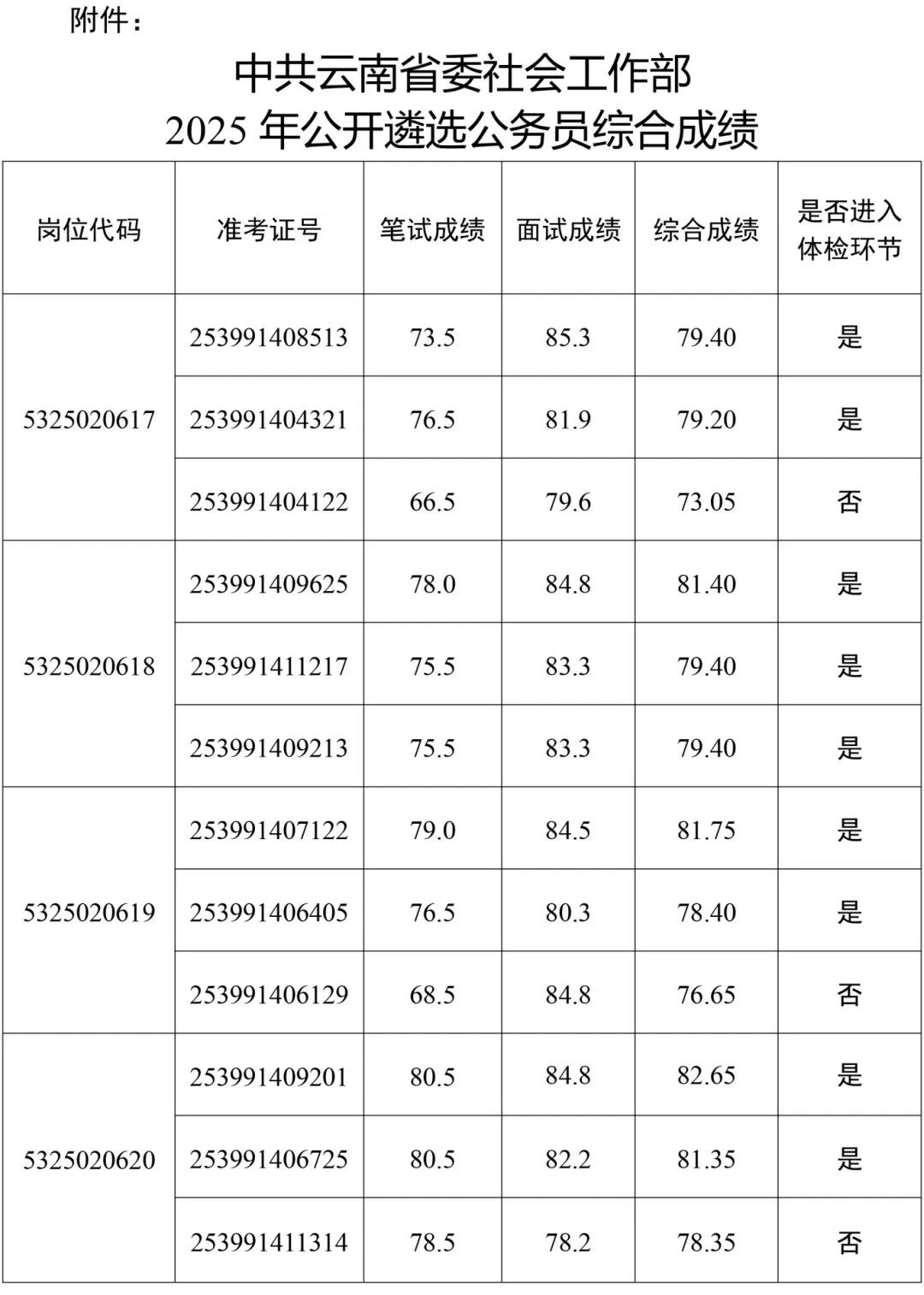附件:中共云南省委社會(huì)工作部2025年公開遴選公務(wù)員綜合成績