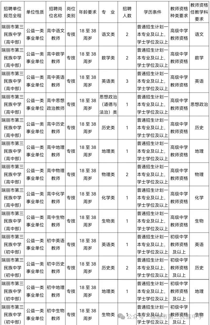 根據(jù)《德宏州人力資源和社會(huì)保障局關(guān)于印發(fā)2026年教育衛(wèi)生部門考核招聘緊缺專業(yè)學(xué)科優(yōu)秀人才工作方案的通知》(德人社發(fā)〔2025〕34號(hào))、《瑞麗市教育體育系統(tǒng)2026年考核招聘緊缺專業(yè)學(xué)科優(yōu)秀人才工作方案》文件精神,2026年瑞麗市第三民族中學(xué)考核招聘緊缺專業(yè)學(xué)科優(yōu)秀人才19名,現(xiàn)將有關(guān)事宜公告如下: