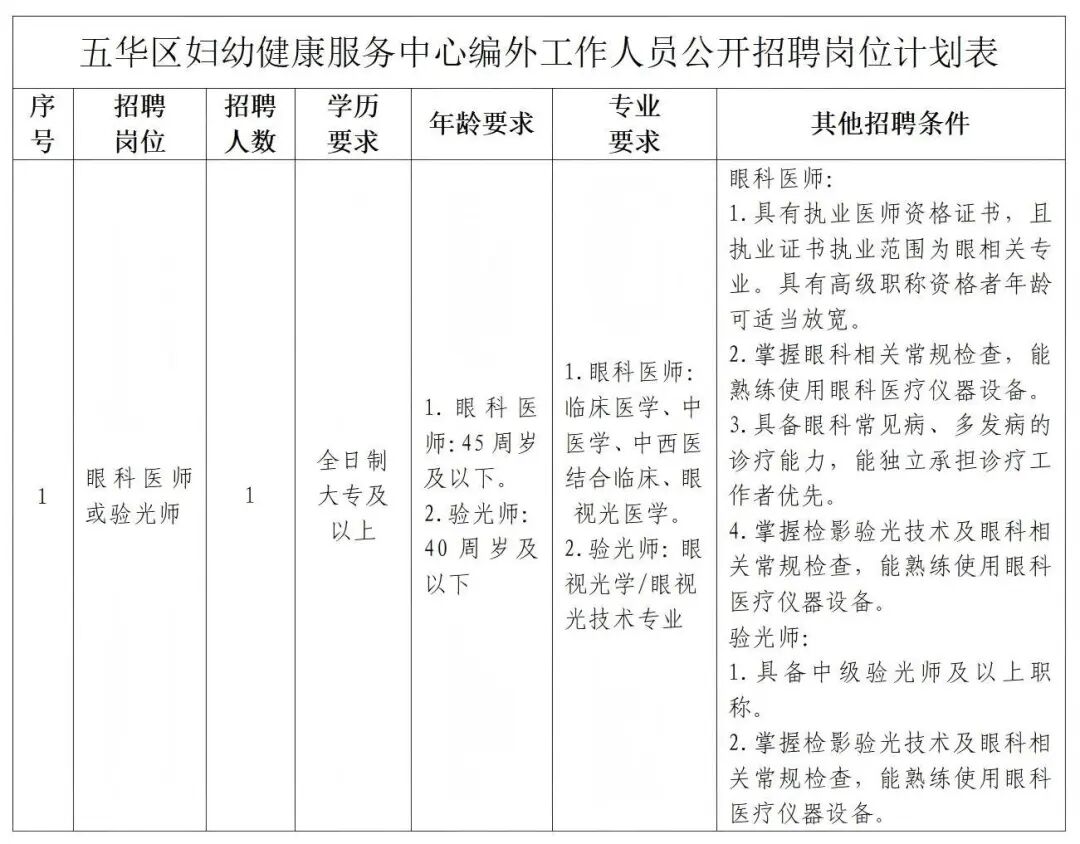 為進(jìn)一步滿足五華區(qū)婦幼健康服務(wù)中心工作開展需要,按照公開、平等、競(jìng)爭(zhēng)、擇優(yōu)的原則,委托云南潤(rùn)邦人力資源服務(wù)有限公司(以下簡(jiǎn)稱公司),面向社會(huì)公開招聘眼科醫(yī)生或驗(yàn)光師1名,現(xiàn)將招聘有關(guān)事項(xiàng)公告如下: