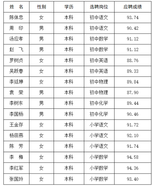 為滿足2018年學(xué)校教育教學(xué)工作的需要,優(yōu)化教師隊(duì)伍結(jié)構(gòu),提高教師隊(duì)伍素質(zhì)。根據(jù)《中共臨滄市委臨滄市人民政府關(guān)于進(jìn)一步深化學(xué)校人事制度改革的意見(jiàn)》(臨發(fā)〔2011〕83號(hào))精神,按照經(jīng)教育主管部門(mén)及人力資源和社會(huì)保障審定同意的《臨滄市第一中學(xué)天有實(shí)驗(yàn)學(xué)校2018年公開(kāi)選聘教師工作實(shí)施方案》,在教育主管部門(mén)、市紀(jì)委市監(jiān)察委駐市教育局紀(jì)檢組和市人社局的監(jiān)督指導(dǎo)下,嚴(yán)格按程序進(jìn)行了方案公告、報(bào)名、資格審查、筆試、資格復(fù)審、面試、體檢等環(huán)節(jié),經(jīng)學(xué)校選聘工作領(lǐng)導(dǎo)組嚴(yán)格考察審核,陳體忠等16名同志符合學(xué)校選聘條件和要求,擬選聘到我校任教,現(xiàn)予以公示,公示期為7天(2017年8月8日至8月14日)。