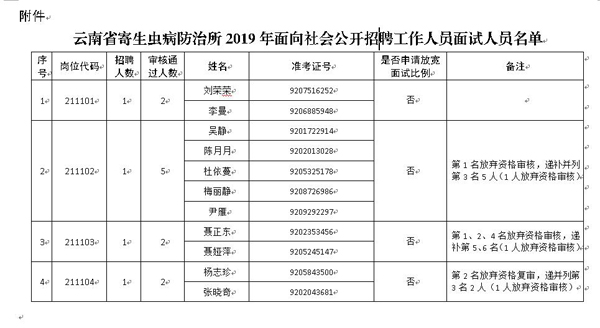 附件:云南省寄生蟲病防治所2019年面向社會公開招聘工作人員面試人員名單