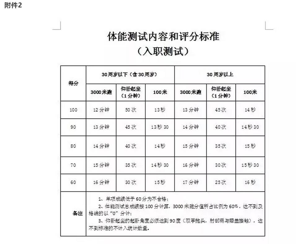 (2)體能測試成績?yōu)?00分,測試科目為100米跑、3000米跑、俯臥撐。3000米跑為必測科目,所占分值為60分;其它兩項任選一項,所占分值為40分,考核達標標準見附件2。