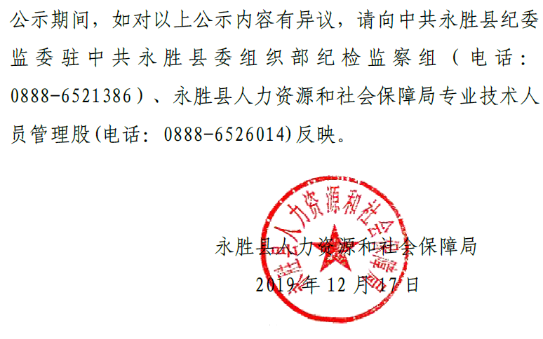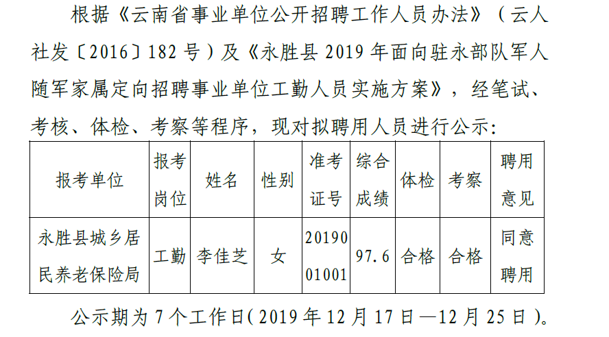 麗江市永勝縣2019年隨軍家屬定向招聘事業(yè)單位人員公示