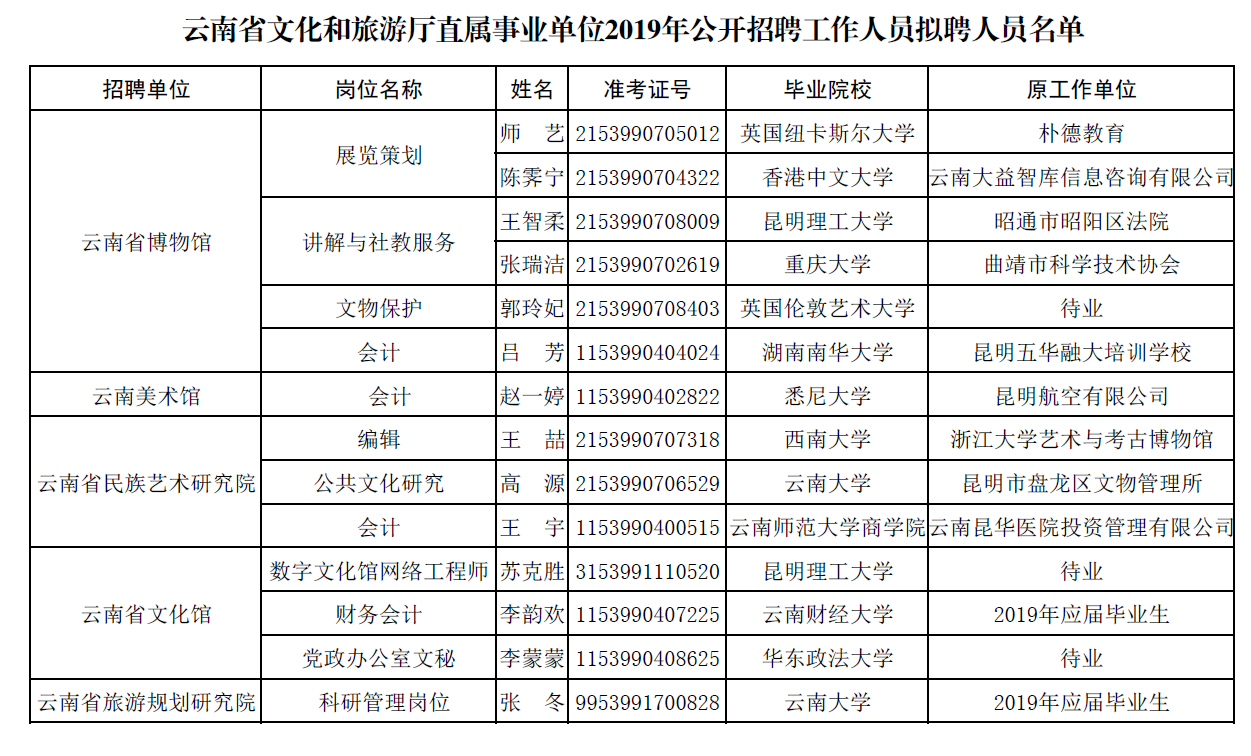 云南省文化和旅游廳直屬事業(yè)單位2019年公開(kāi)招聘工作人員擬聘人員公示
