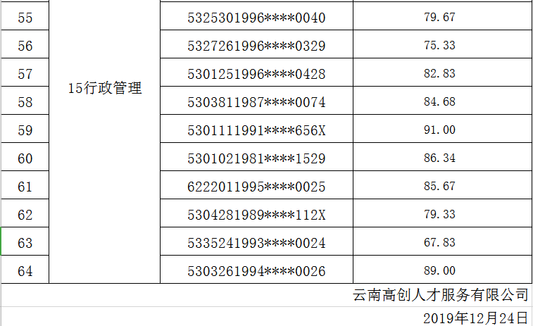 云南高創(chuàng)人才服務有限公司為云南藝術學院招聘勞務派遣制員工2019年12月20日面試成績結果如下: