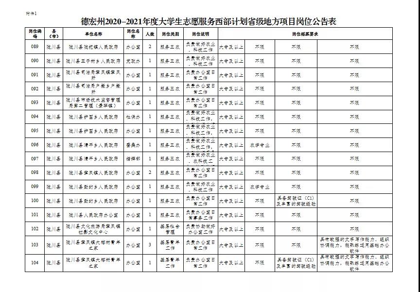 根據(jù)共青團中央 教育部 財政部 人力資源和社會保障部《關(guān)于印發(fā)<2020-2021年度大學(xué)生志愿服務(wù)西部計劃實施方案>的通知》(中青聯(lián)發(fā)〔2020〕6號)、云南省大學(xué)生志愿服務(wù)西部計劃項目管理辦公室《關(guān)于開展大學(xué)生志愿服務(wù)西部計劃相關(guān)工作的通知》等文件精神,現(xiàn)將德宏州2020-2021年度大學(xué)生志愿服務(wù)西部計劃省級地方項目志愿者招募工作有關(guān)事項公告如下。