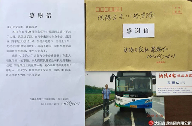 8月20日下午,沈陽(yáng)突降大雨,鑫暢巴士v111路駕駛員吳堃駕駛公交車(chē)駛至莫子山公園附近時(shí),看到一位老人在路邊徘徊,全身已被雨水澆透。雖然老人沒(méi)有在站點(diǎn)位置等車(chē),但吳堃見(jiàn)老人狀態(tài)不佳,于是將車(chē)??吭诼愤?。走近后見(jiàn)老人臉色慘白,嘴唇已經(jīng)沒(méi)了血色,便關(guān)切地詢(xún)問(wèn)道,老人稱(chēng)自己迷了路,找不到回家的方向了。于是吳堃第一時(shí)間將老人帶回了車(chē)隊(duì),找來(lái)干毛巾把老人身上的雨水擦干,喝了熱水后老人逐漸緩了過(guò)來(lái)。原來(lái),老人姓欒,家住五愛(ài)街,到莫子山公園游玩,突然下起了雨,他趕緊往山下跑,卻因新修路不熟悉路形而迷失了方向。